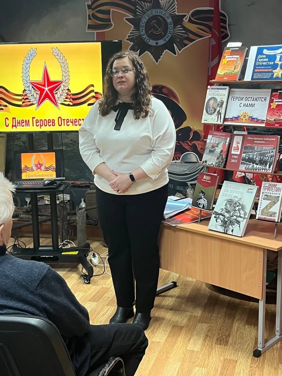 Методист Ю. А. Разуваева рассказала о культурно-просветительском проекте «Стихи и песни о войне», который реализуется на площадке библиотечной радиостудии в честь Года защитника Отечества и 80-летия Великой Победы.