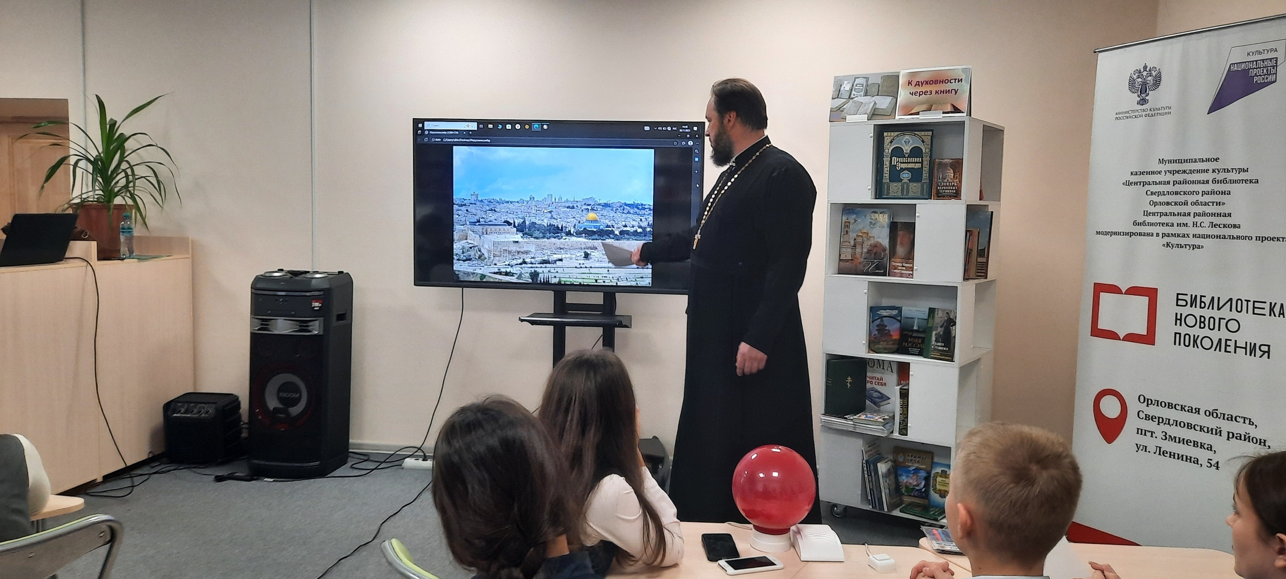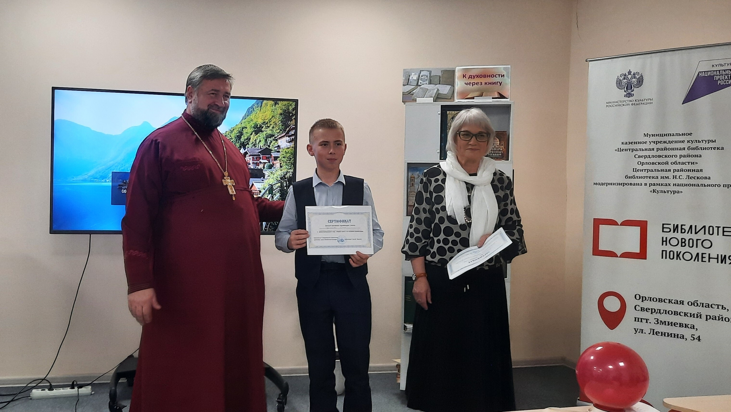 На площадке Центральной районной библиотеки им. Н. С. Лескова сошлись команды «Пламя» (МБОУ «Змиевский лицей», руководитель Щиголева Е. В.) и «Атом» (МБОУ «Змиевская СОШ», руководитель Кошелева О. С.). Участники отвечали на простые и сложные вопросы, посвященные Священному Писанию Ветхого и Нового Заветов, истории Православной Церкви и ее богослужебной практике.