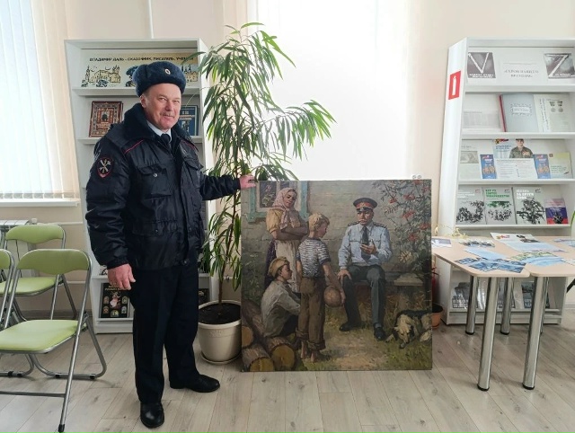 Благодарим Александра Николаевича за этот ценный дар. Картина неизвестного автора не только украсит стены библиотеки, но и будет напоминать нам о важности и сложности службы людей в погонах, а также будет способствовать патриотическому воспитанию молодого поколения.