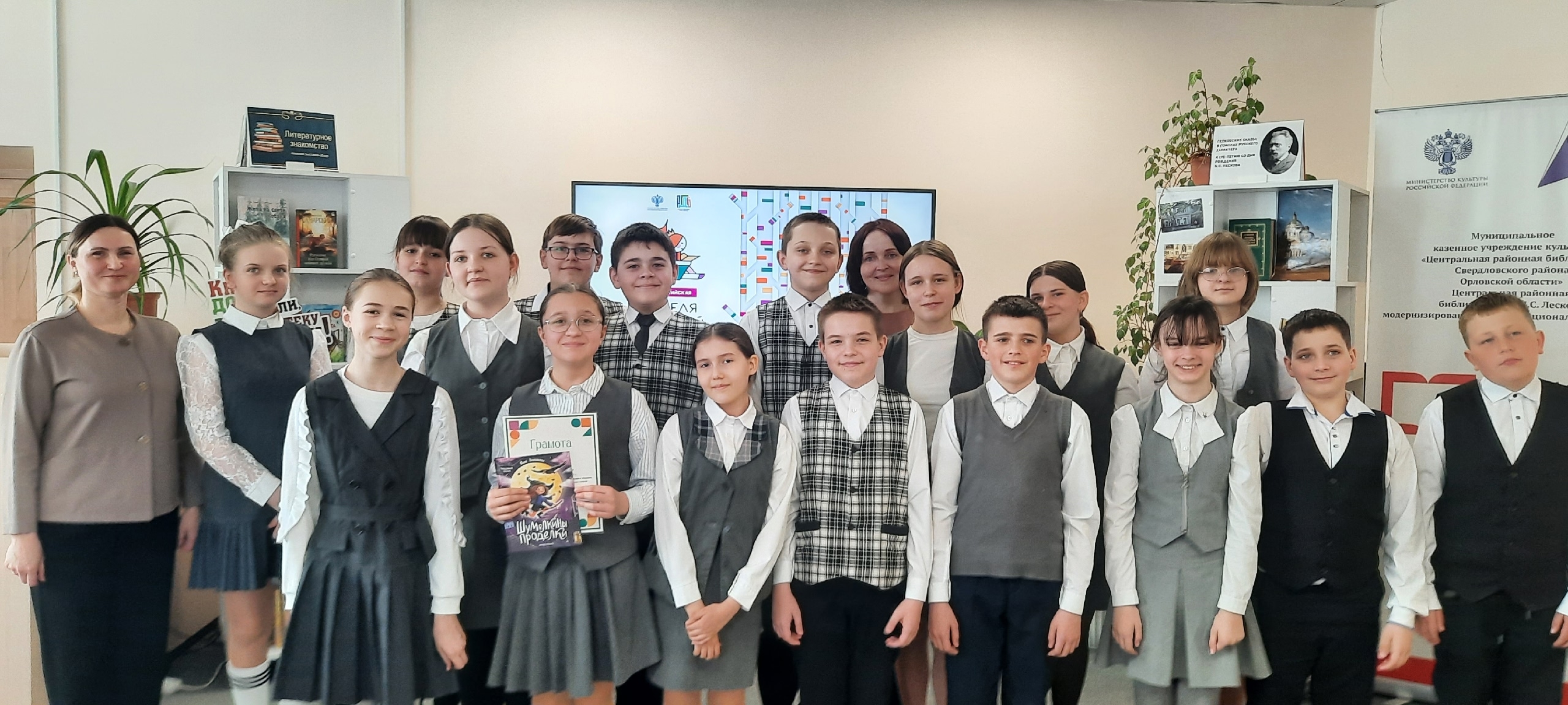 26 марта в Центральной районной библиотеке имени Н.С. Лескова в рамках Недели детской книги прошла встреча "Литературное знакомство". В ней участвовали ученики 5 класса МБОУ "Змиевская СОШ" вместе с классным руководителем Юлией Николаевной Любиной.
