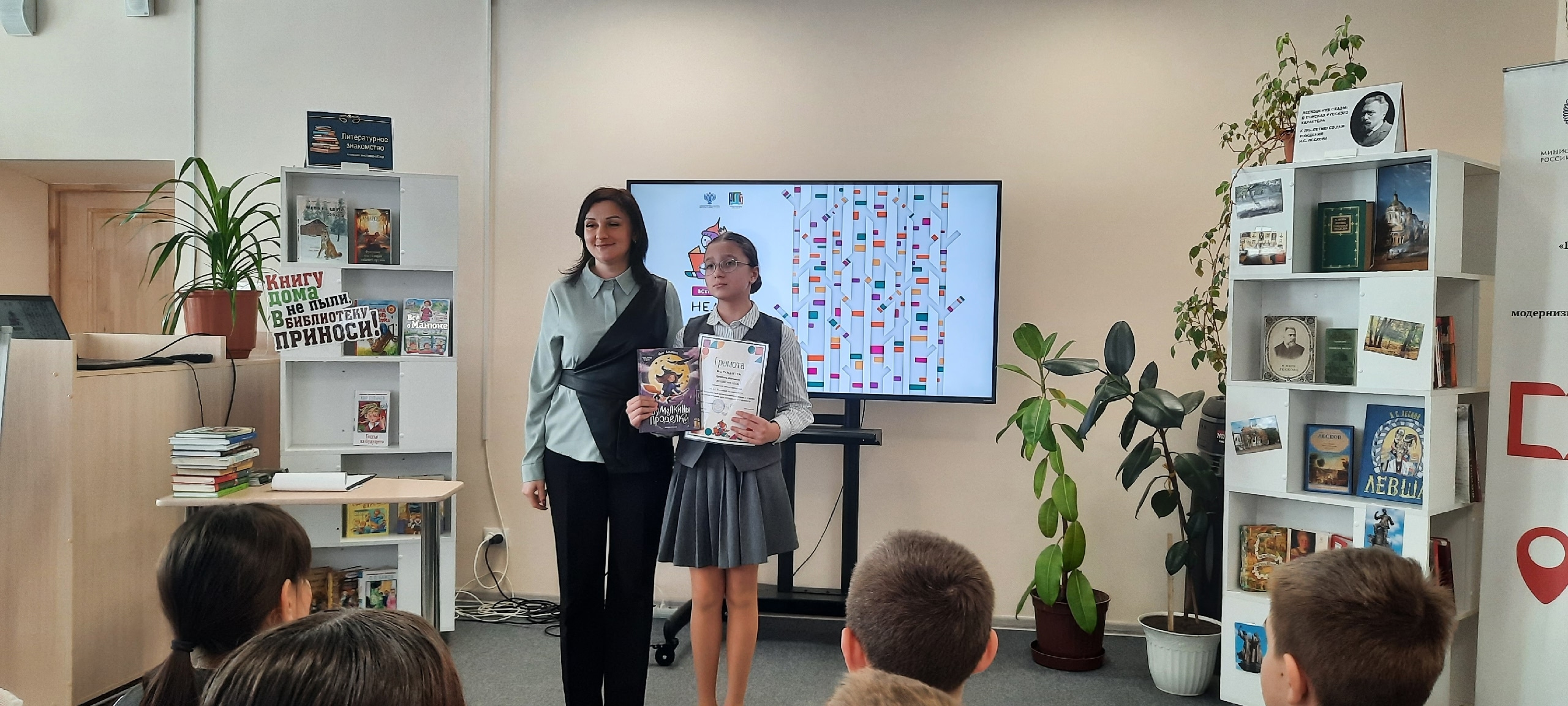 В конце встречи библиотекарь ЦДБ им. Е.А. Благининой, Елена Бибаева, поздравила участников с Неделей детской книги и началом весенних каникул. Она вручила грамоту и подарок Трушкиной Анастасии за любовь к книге и чтению.
